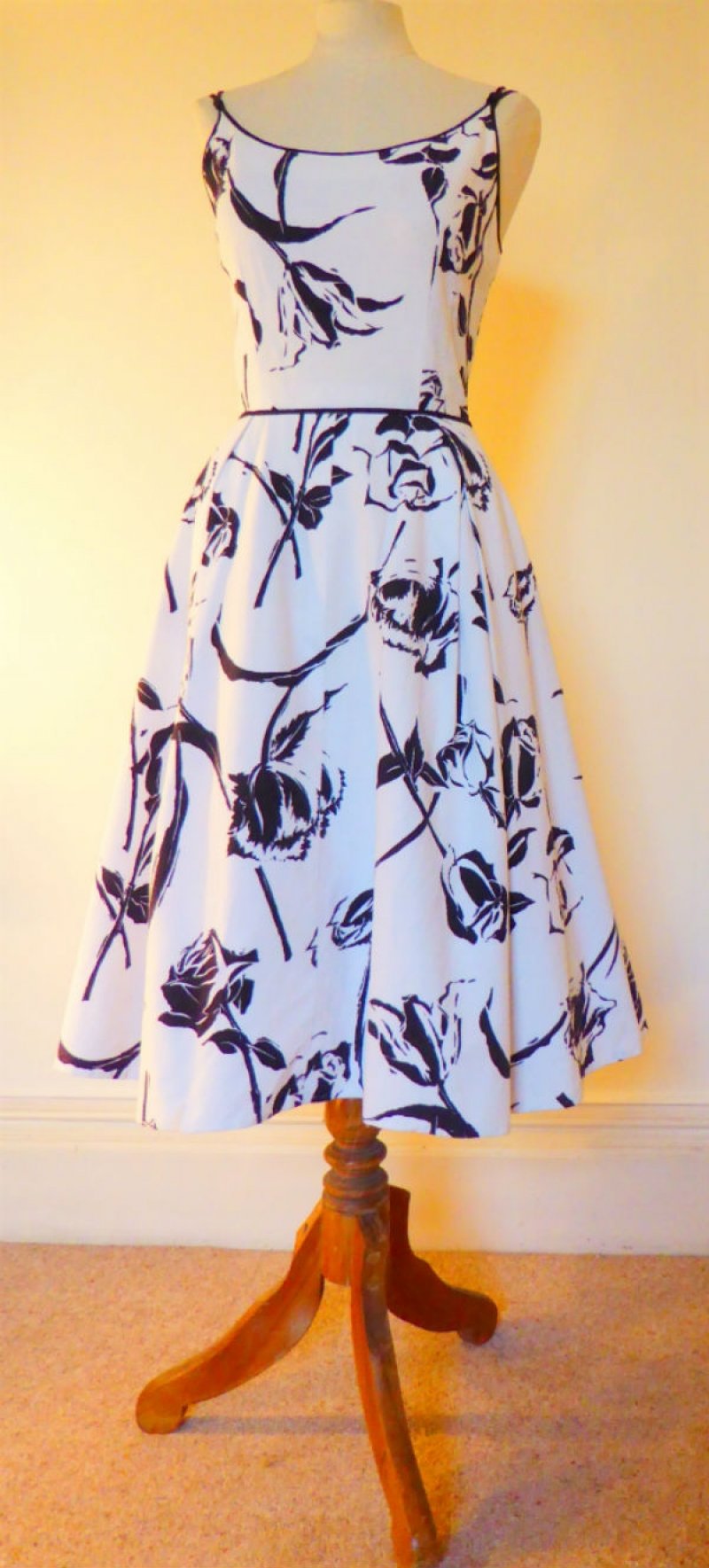 White cotton pique summer dress with black roses, size L