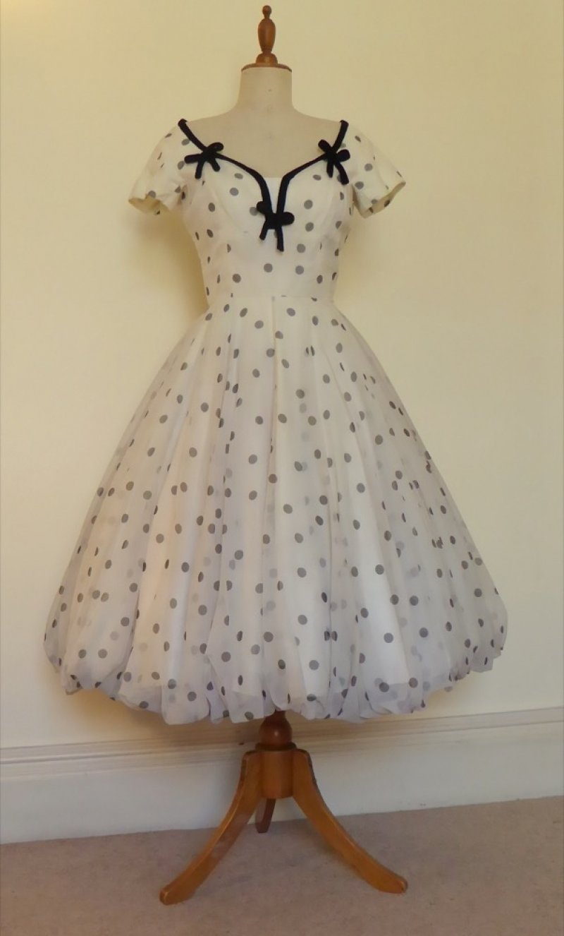 WF86 White chiffon 1950s ballerina-length dress with black polka dots and velvet trim, size M